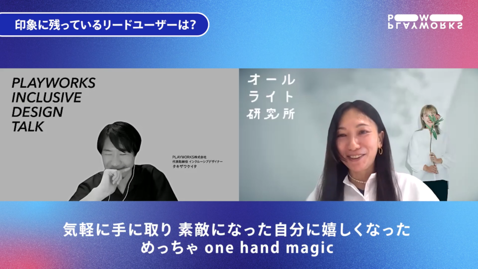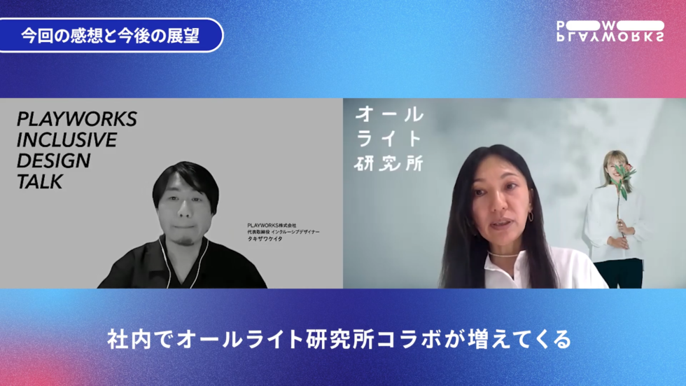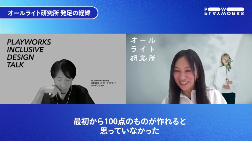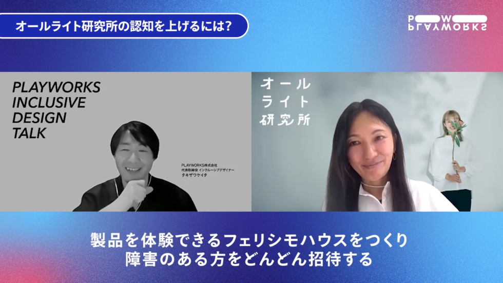 インクルーシブデザインの第一線で活動するゲストと PLAYWORKS タキザワが、インクルーシブデザインの価値や可能性について、対談形式で探究する「INCLUSIVE DESIGN Talk」。今回は、株式会社フェリシモ オールライト研究所 プロジェクトリーダーの筧麻子さんにお越しいただきました。オールライト研究所が立ち上がった背景や商品開発の裏側について伺いました。