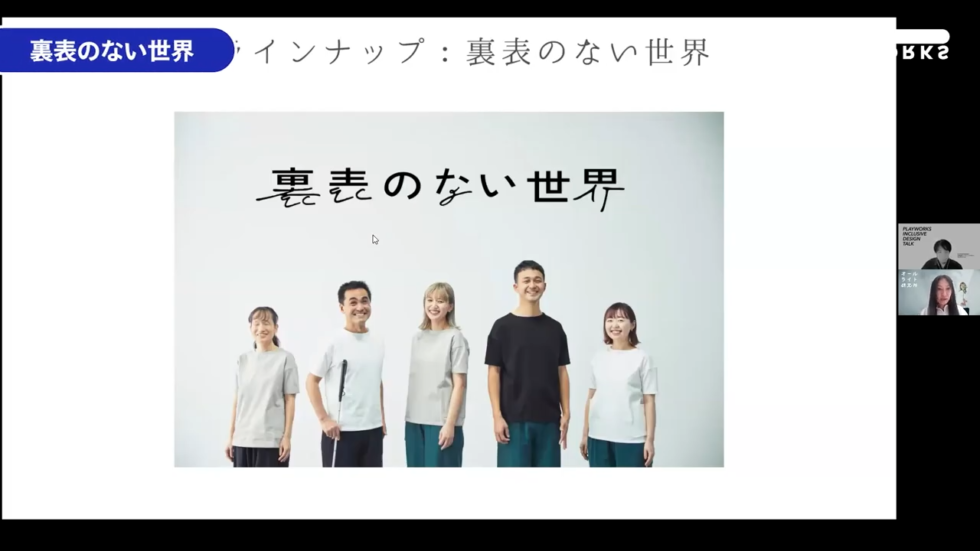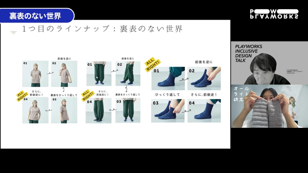 1つ目は「裏表のない世界」です。裏表前後のないTシャツやパンツ、靴下を展開しています。商品開発に協力してくださったのは、写真左の白杖を持った方と、そのお隣の全盲のご夫婦、筋ジストロフィーという疾患をお持ちの電動車いすユーザーの方。他にも、視覚障害の方や知的障害のお子様をお持ちの方にもお話を聞きました。