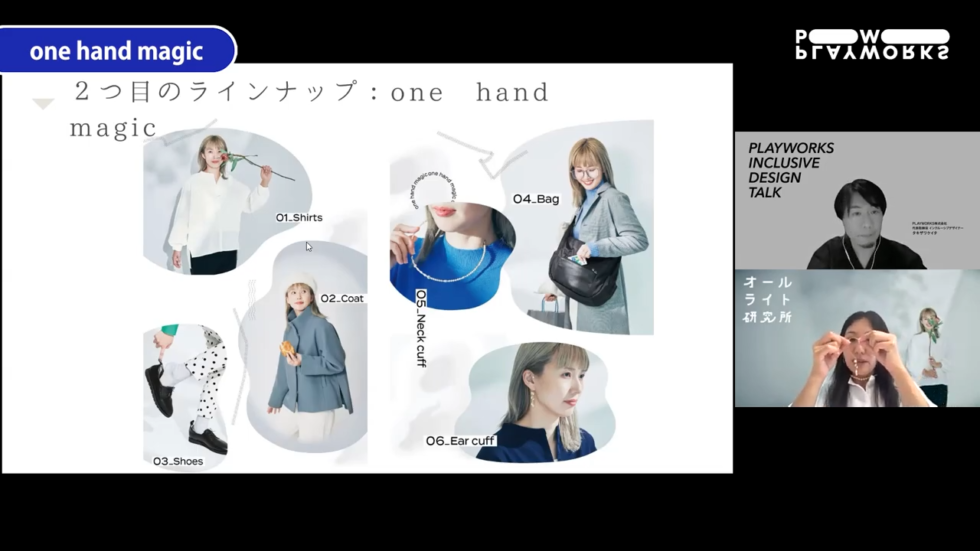 筧:one hand magicというブランド名を決める時が一番困りました。「one hand magicって、両手で使える人も自分事として感じられるのかな」という問いを社内のメンバーからいただいたのですが、それに対する返答がうまくできなかったんです。澤田さんは「ファッションとしてすごく響きの良い名前で、意味も素敵だから推したい」と言ってくださったのですが、片手だけ使える方・両手を使える方のどちらにも使いやすいと伝えられるようにするための落としどころがうまく見つけられなかったですね。